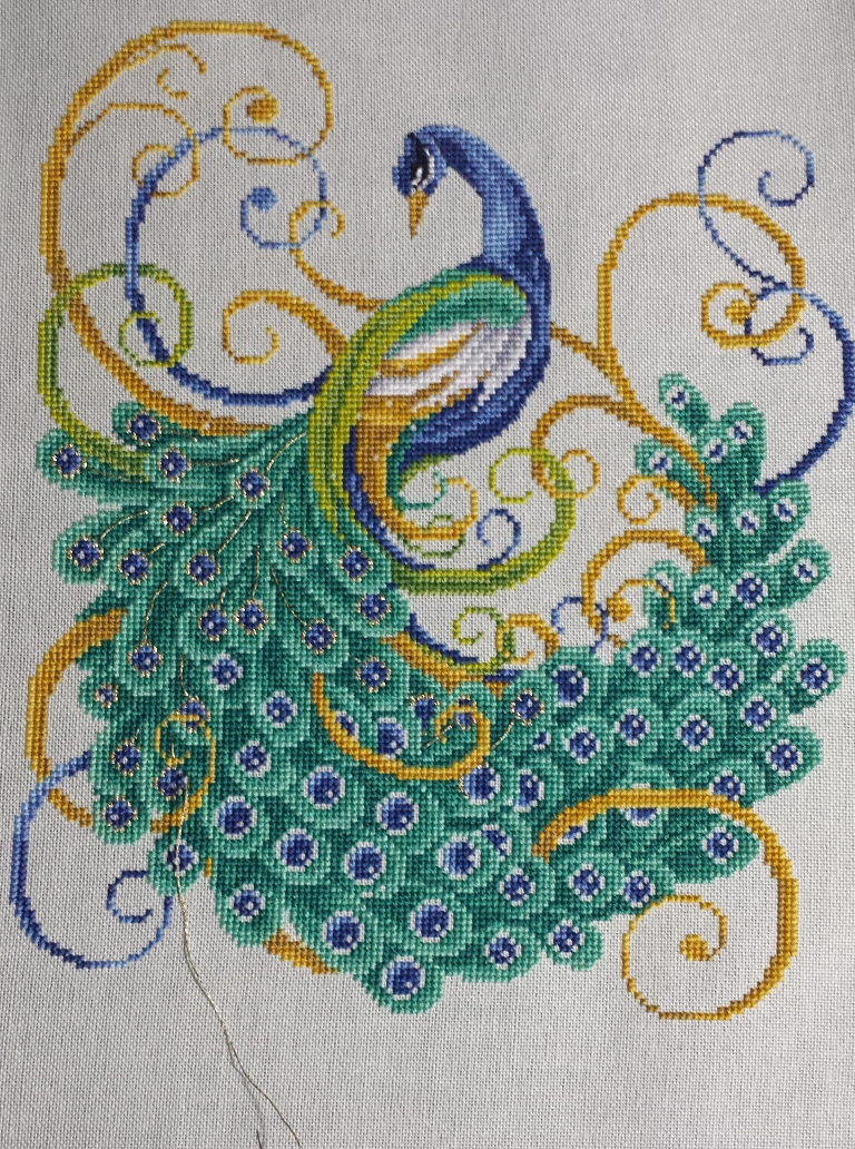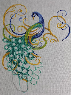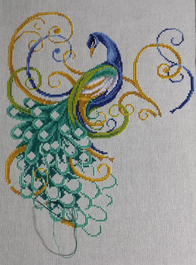 I was hoping to finish the tail this month, but I don't think that will happen. On the positive side I listened to a really great audiobook this week (League of Dragons by Naomi Novik) and was pretty much glued to my needlework the whole time. Swirling Peacock went from this: